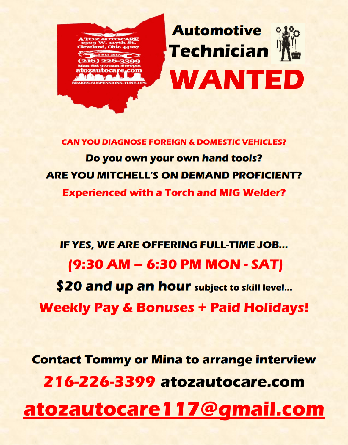 Since 2017, A to Z Auto Care has provided motorists in the Lakewood and Cleveland’s west side area with comprehensive auto repair services that include General Services, Car & Truck Care, Inspections and Under car Services, Brakes, Tires, Engine & Transmission, Engine Maintenance, Transmission Services, 4×4 Services, Heating and Cooling Services, Electrical Services, Electronic Services, Miscellaneous Services, Domestic Cars & Trucks, Import Cars & Trucks. Our goal is to offer the best services available at affordable prices to get you back on the road in no time..